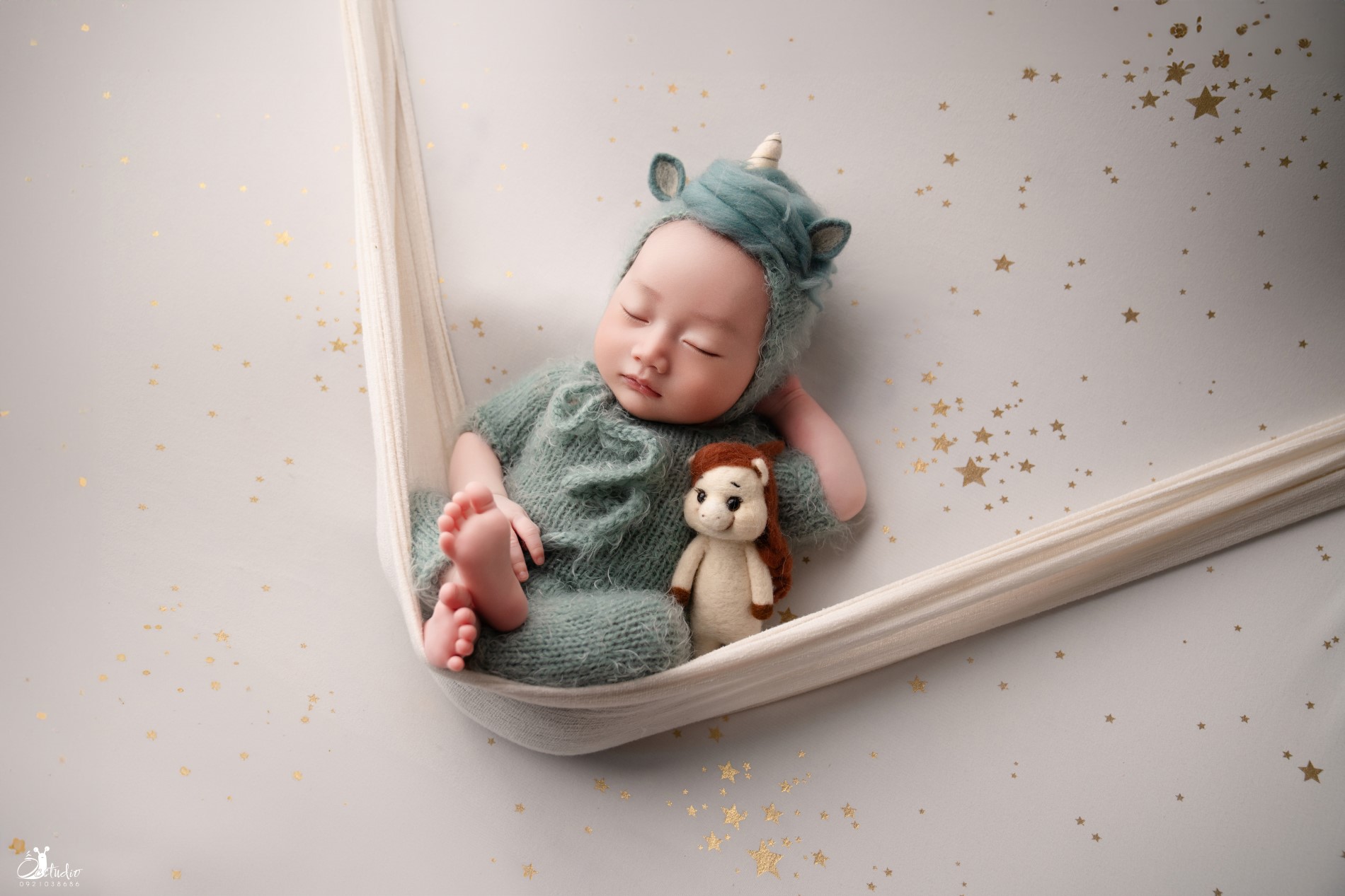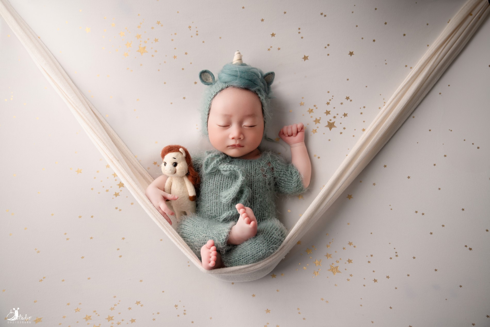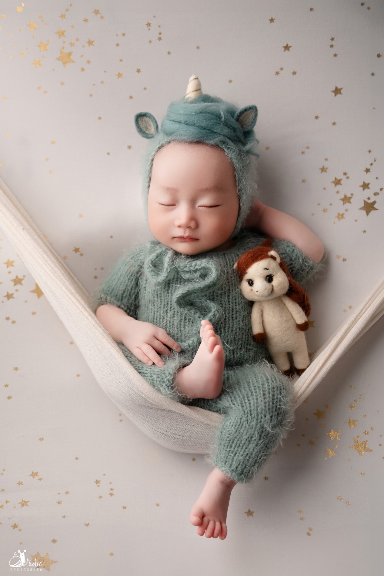 Tone xanh mint nhẹ nhàng, tây tây xịn xịn, lên hình vừa trong trẻo vừa sang mà không hề bị sến. Bé chỉ cần nằm ngoan xíu thôi là đã hóa thành “em bé unicorn” đáng yêu hết nấc rồi!