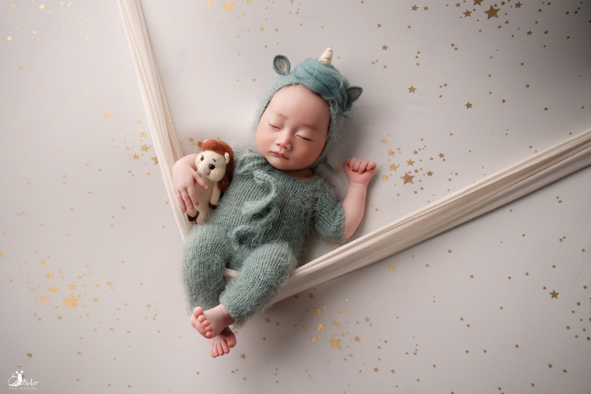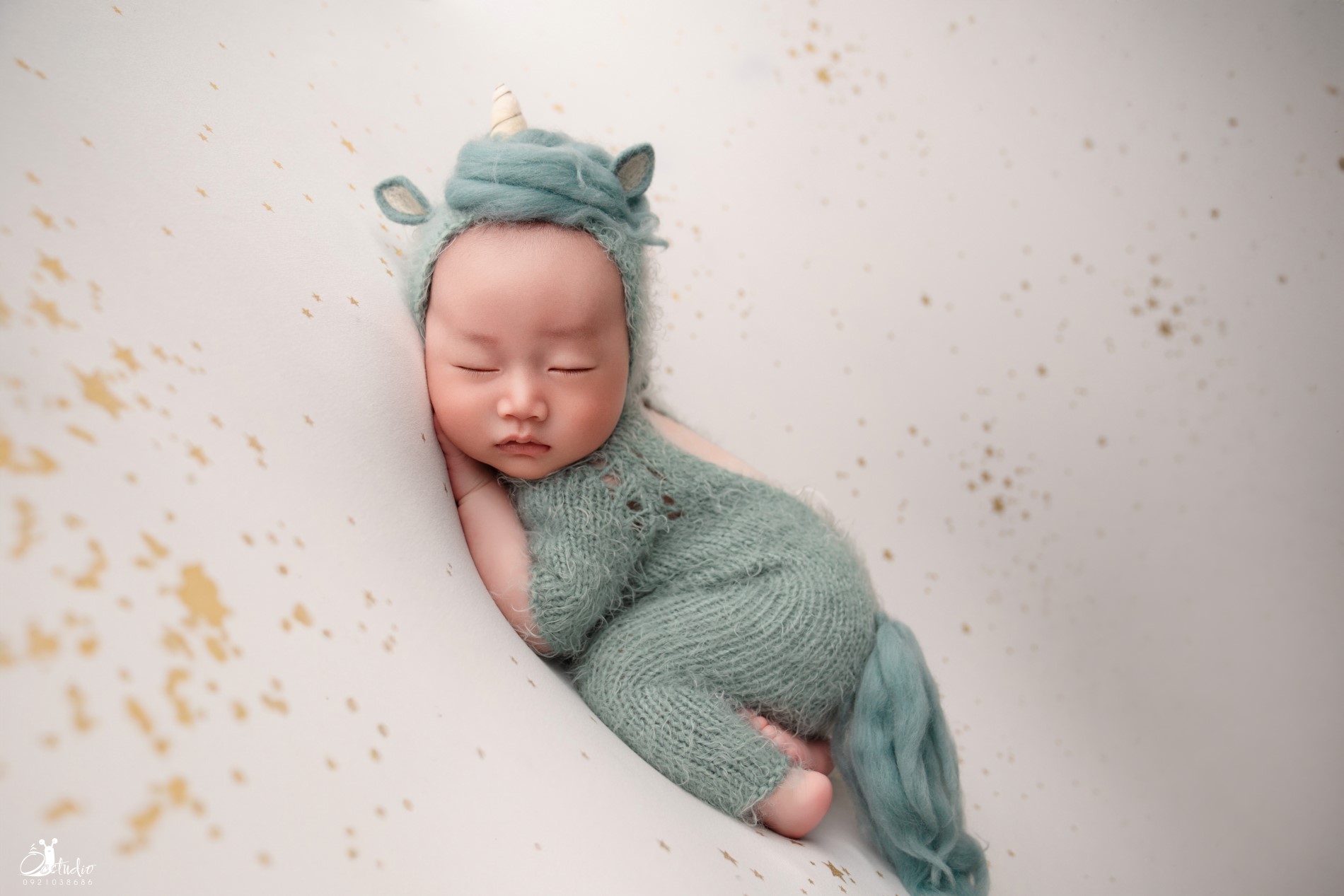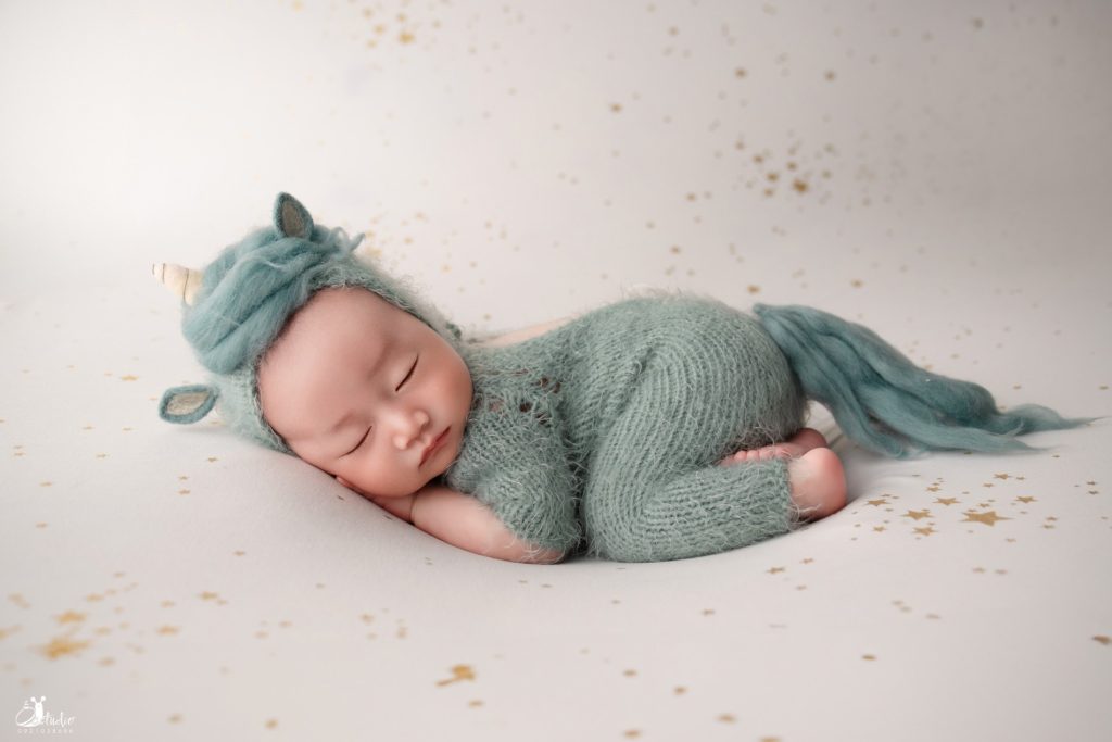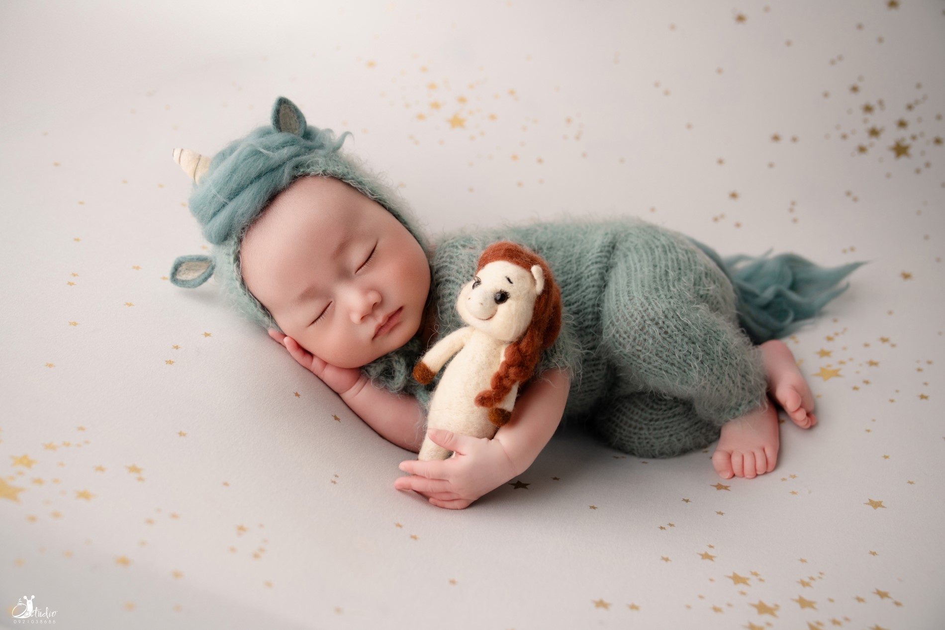 Tone xanh mint nhẹ nhàng, tây tây xịn xịn, lên hình vừa trong trẻo vừa sang mà không hề bị sến. Bé chỉ cần nằm ngoan xíu thôi là đã hóa thành “em bé unicorn” đáng yêu hết nấc rồi!