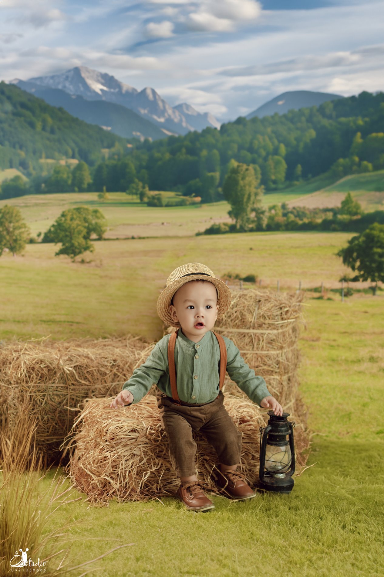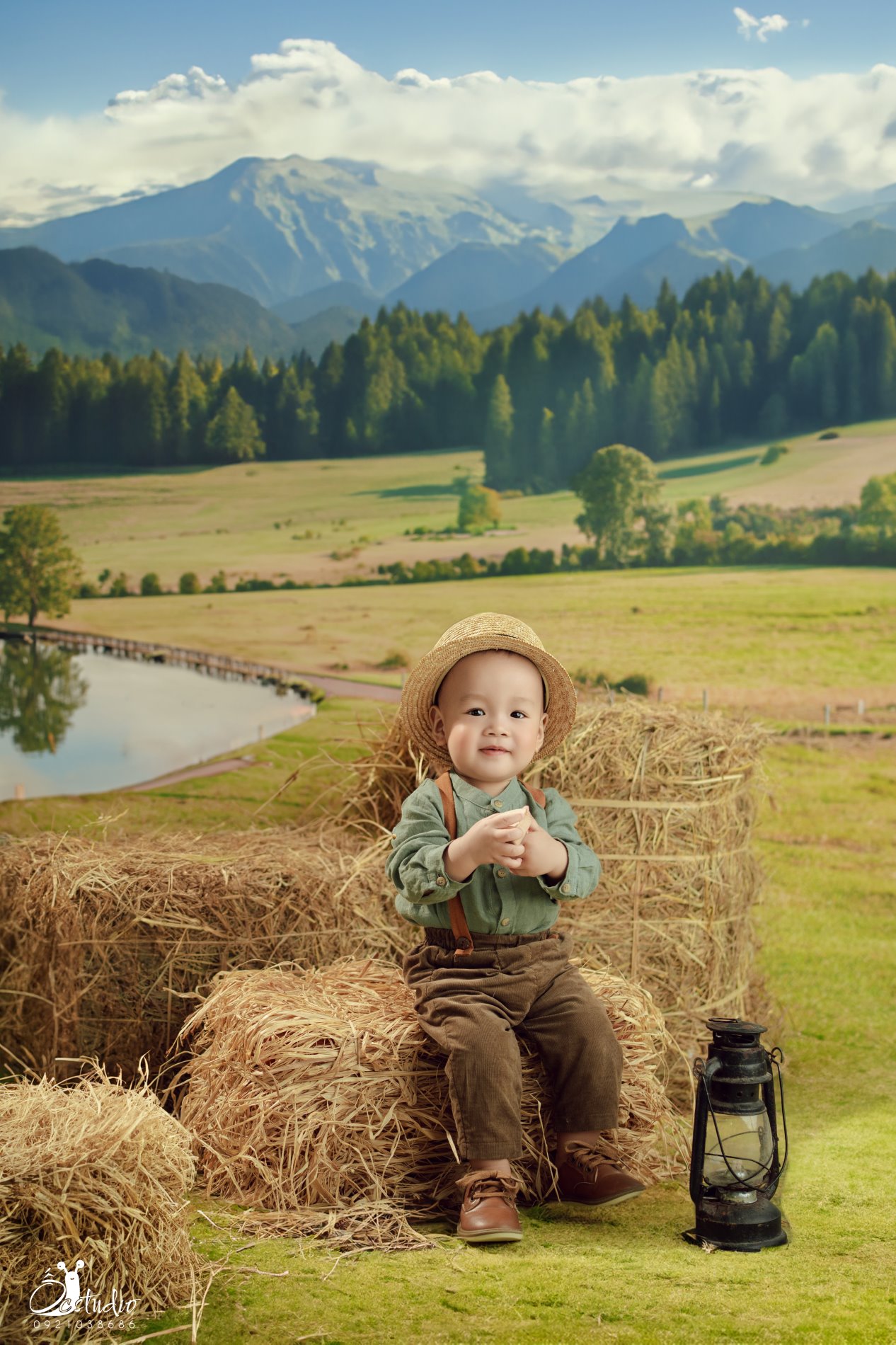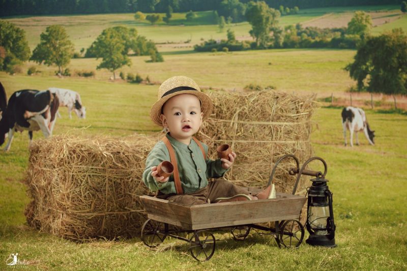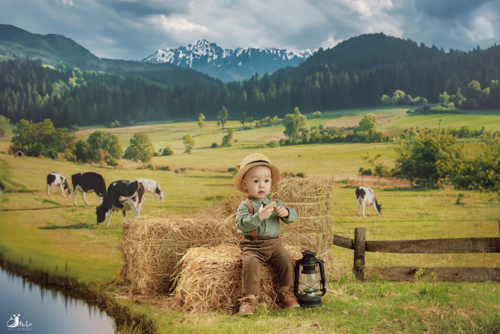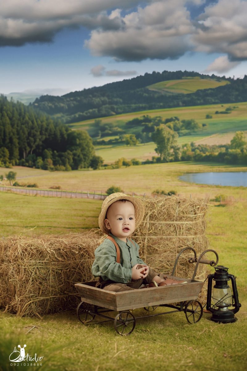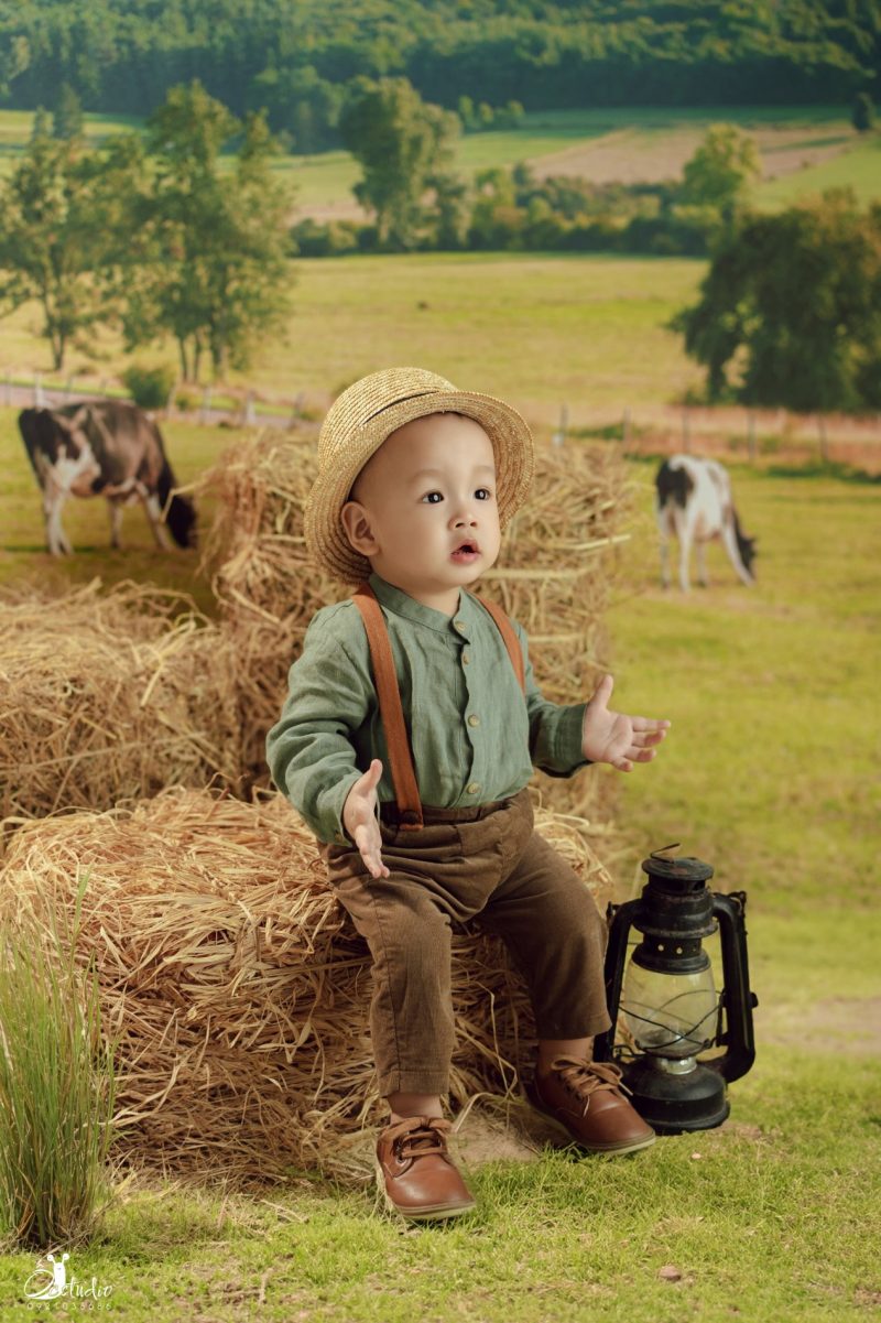 Dưới bầu trời xanh mát, “ông chủ nông trại nhí” ngồi bên đống rơm vàng, ánh mắt lấp lánh như đang ấp ủ những giấc mơ thật lớn.